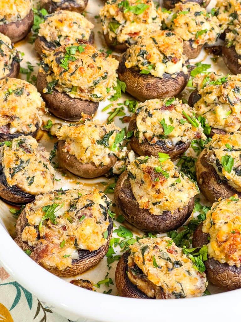 These Cheesy Bacon Spinach Stuffed Mushrooms are everything you want in a party appetizer: savory, cheesy, bite-sized, and absolutely irresistible.