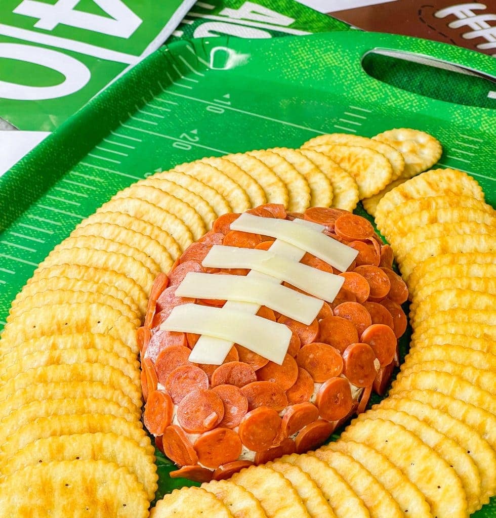This Football Cheese Dip is made with simple panty ingredients: cream cheese, cheddar cheese, and seasonings, but is elevated with the addition of mini pepperoni to resemble a football.