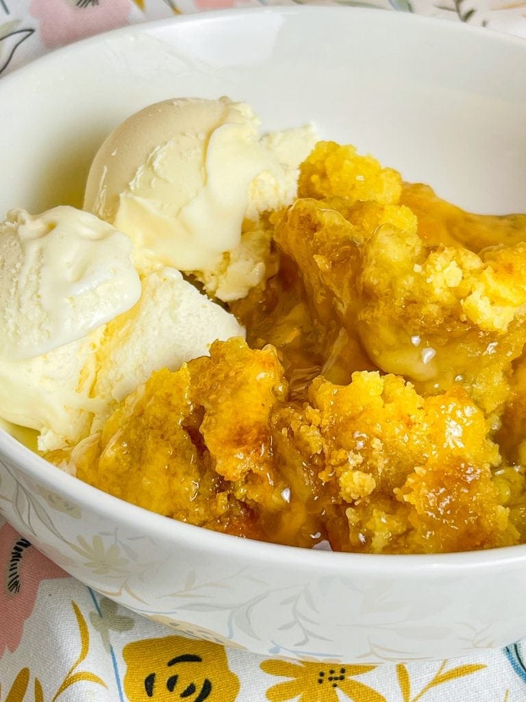 Only 3 easy ingredients and feeds a crowd! Serve this warm peach cobbler with a side of cool vanilla ice cream for the ultimate hands-off dessert.