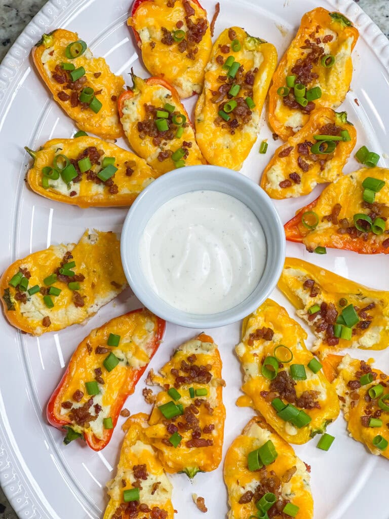 Mini sweet peppers are stuffed with savory Boursin cheese and sharp cheddar cheese, baked until gooey, and topped with crisp bacon and bright green onions for the perfect cheesy bite.