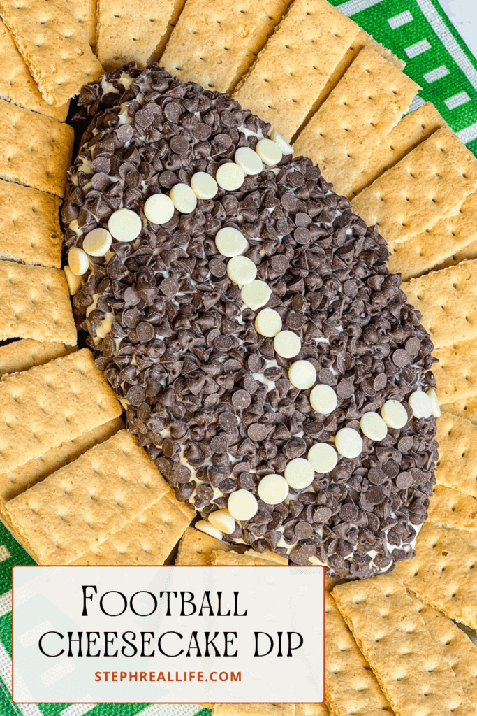 Game day just got sweeter! 🏈 This creamy Football Cheesecake Dip is shaped like a football, covered in a layer of mini chocolate chips, and finished with white chocolate chip laces.
