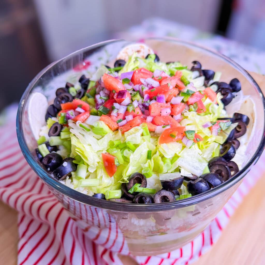 This simple extra step instantly transforms your 7-layer dip into a holiday centerpiece that guests won’t stop talking about.