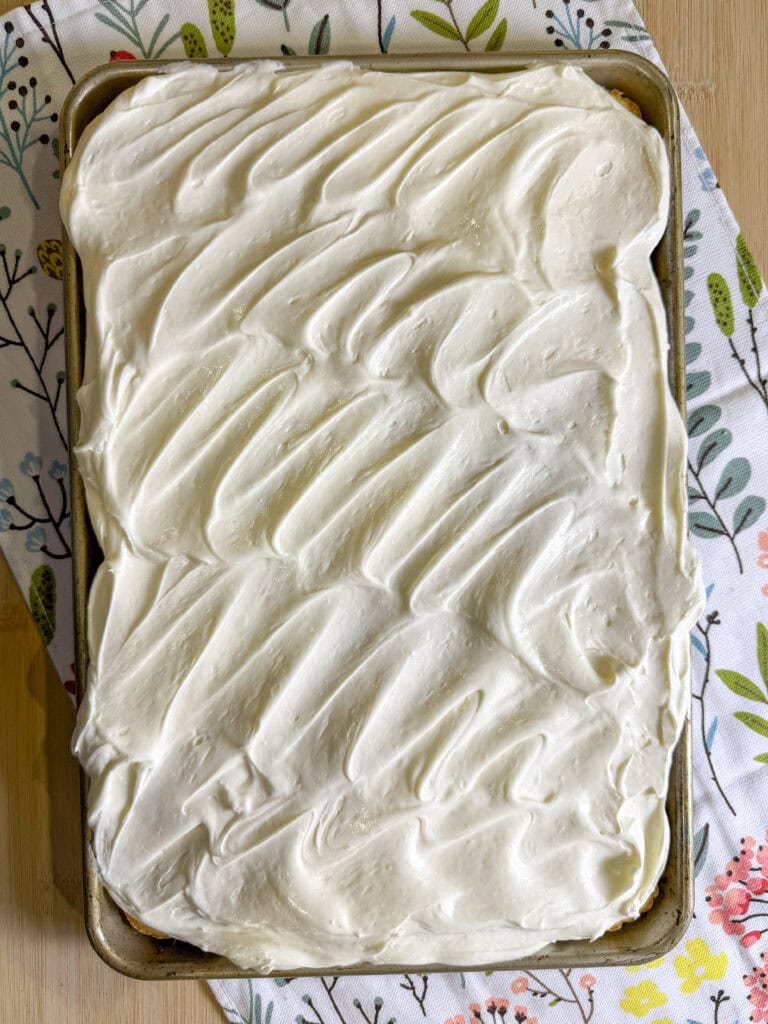 My Aunt Donna brought this impressive cake to Easter dinner last year and it disappeared fast! That frosting! It’s so simple yet so delicious! It’s irresistible fluffy cream cheese icing—light, creamy, and not too sweet. Plus it comes together in no time.