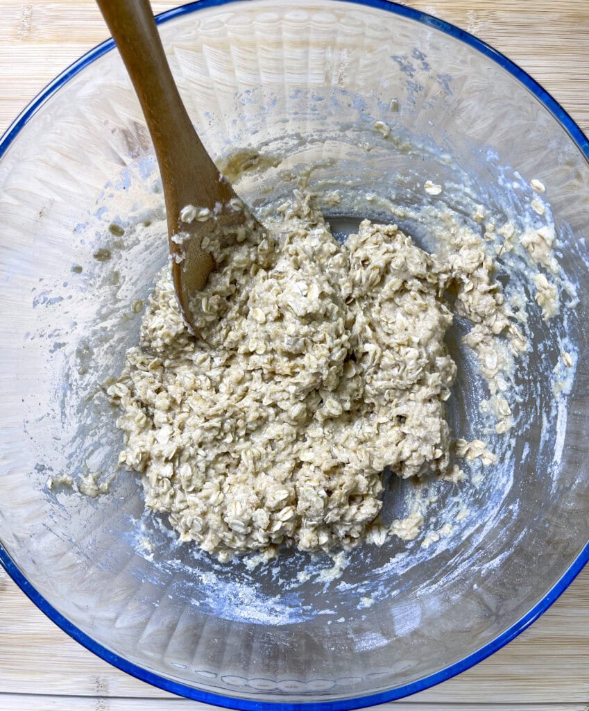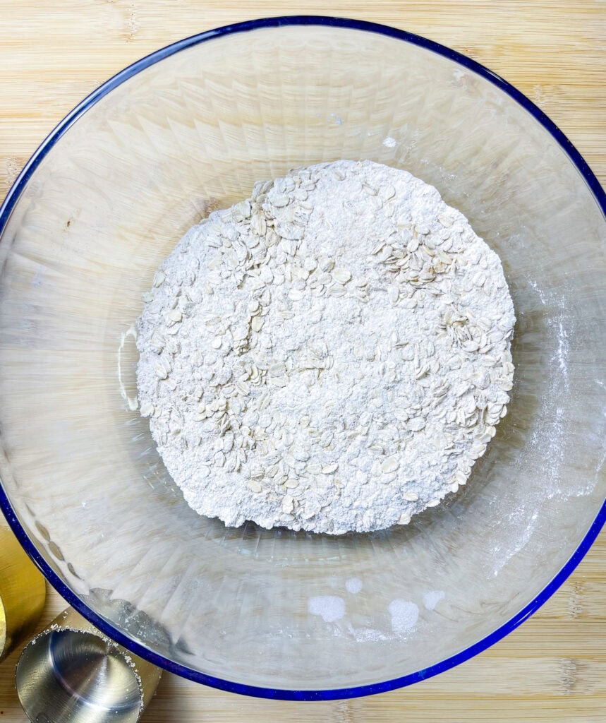 - In a large bowl, combine oats, flour, baking soda, cinnamon, salt, and brown sugar. Stir in melted butter, applesauce, and vanilla extract until crumbly and well mixed.