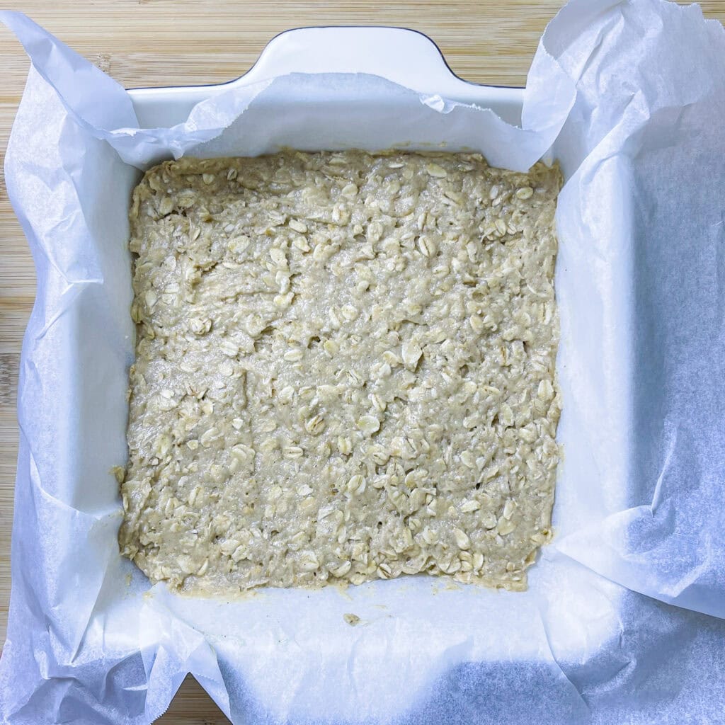 - Sprinkle the remaining oat mixture over the filling as a topping.