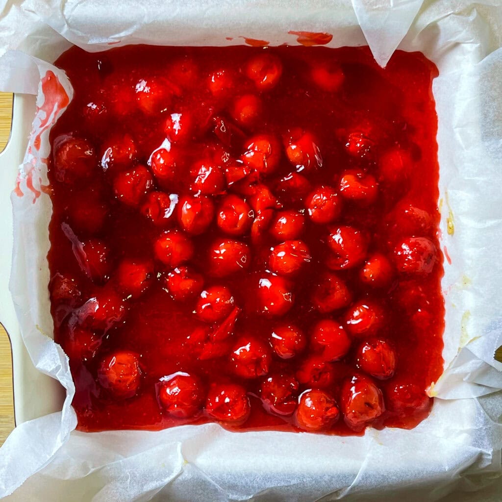 While the crust bakes, mix the cherry fruit filling, applesauce, and lemon juice. Spread this filling evenly over the warm crust.