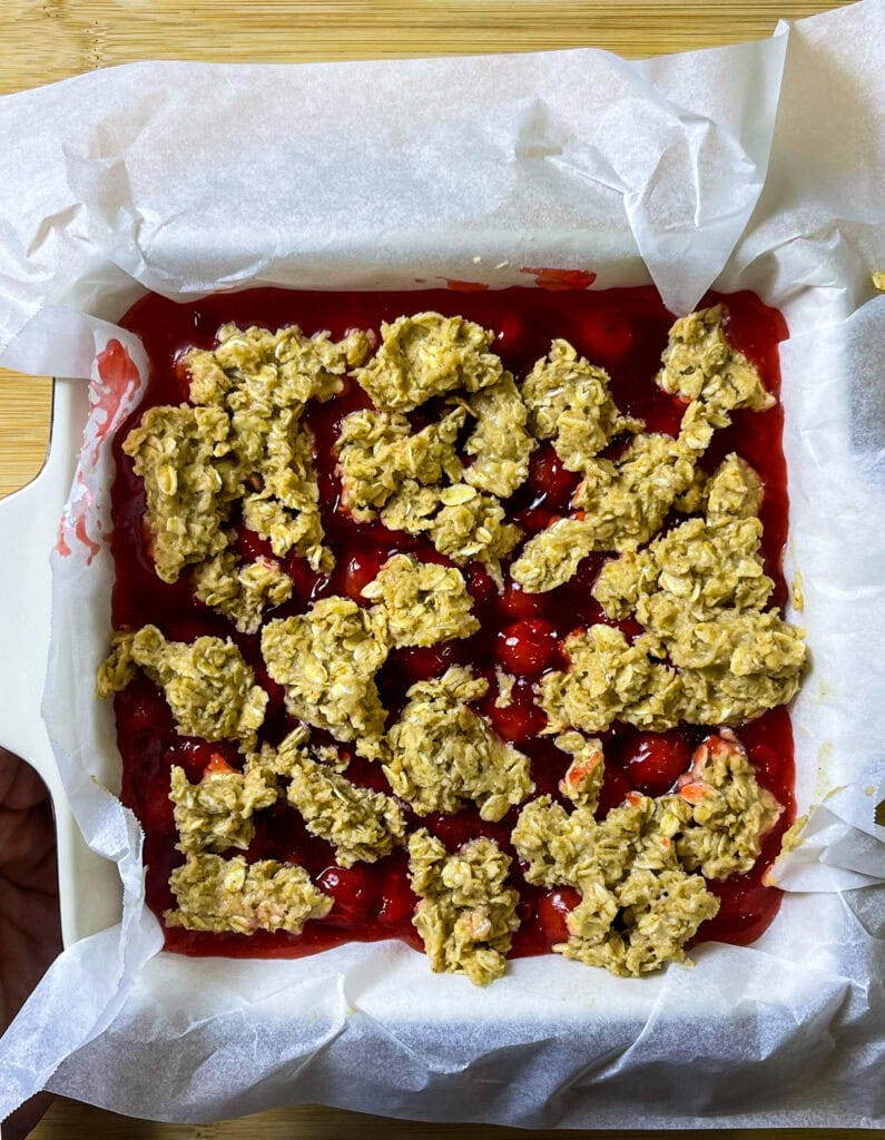 Sprinkle the remaining oat mixture over the filling as a topping.