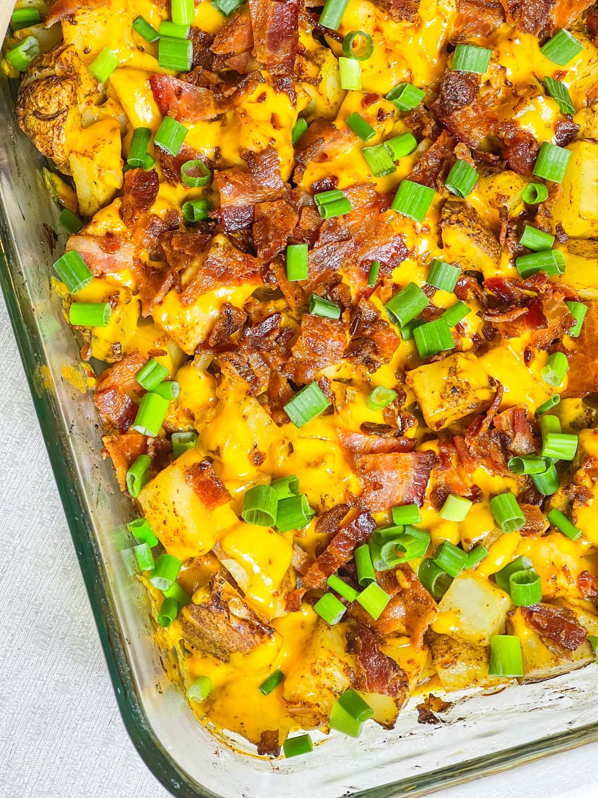 This Chicken Bacon Ranch Casserole is loaded with ranch seasoned potatoes and juicy chicken, topped with melty cheddar cheese and crisp bacon. It reminds me of loaded potato skins- for dinner!