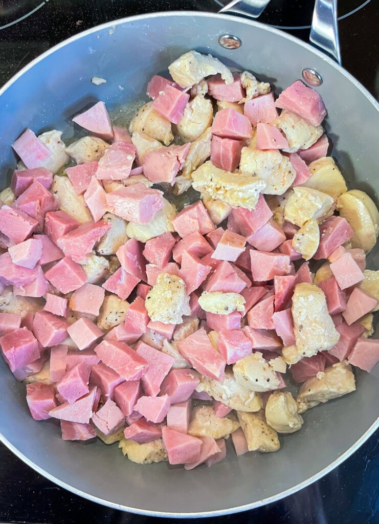 Absolutely! You can skip the sauté step and just mix in shredded rotisserie chicken with the diced ham before adding the sauce.