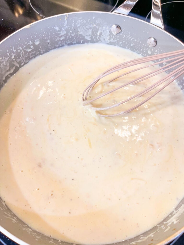 In the same skillet, melt 2 tablespoons of butter and add the minced garlic. Whisk in the flour and cook for 1 minute. Gradually whisk in the milk and cream and bring to a gentle simmer.