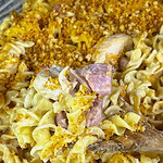 - Add the chicken, ham, and any pan juices to the cooked noodles and toss to combine.