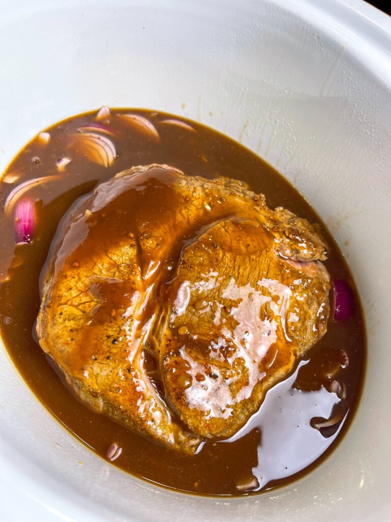 - In a bowl, combine BBQ sauce, beef broth, apple cider vinegar, and brown sugar. Pour over the roast.