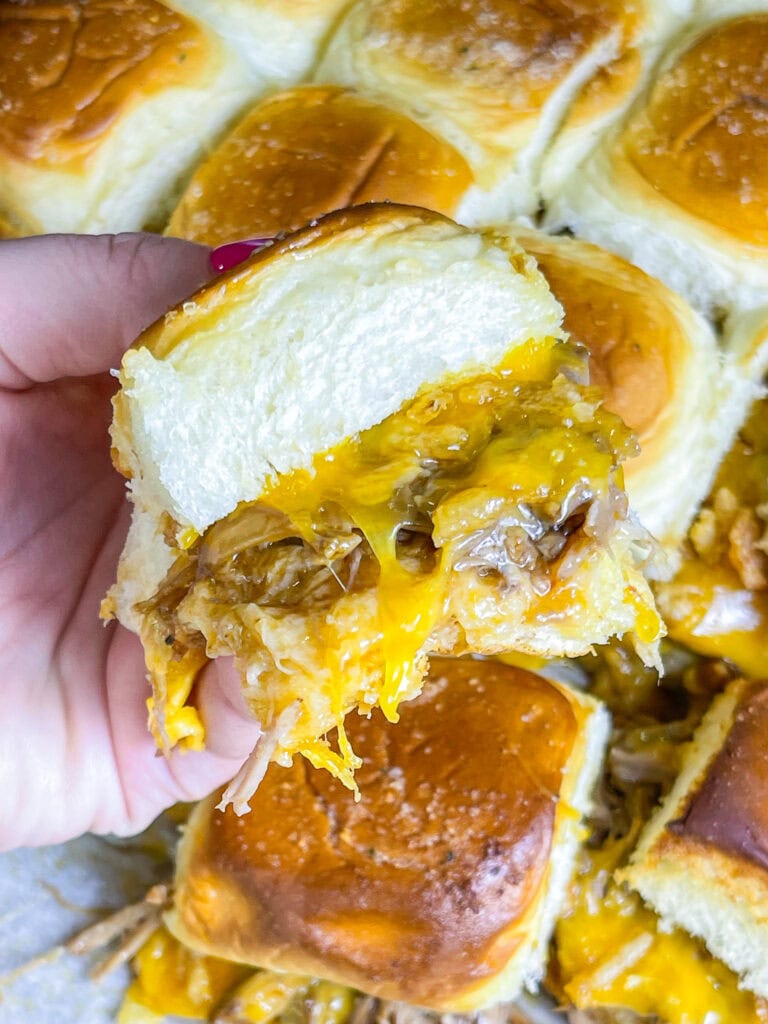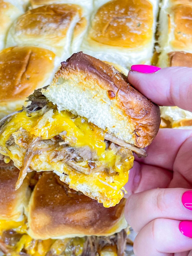 OR- you can pile the beef high on slider buns, add a bunch of cheddar cheese, crisp pickles and crunchy fried onions and serve crave-worthy BBQ Beef Sliders.