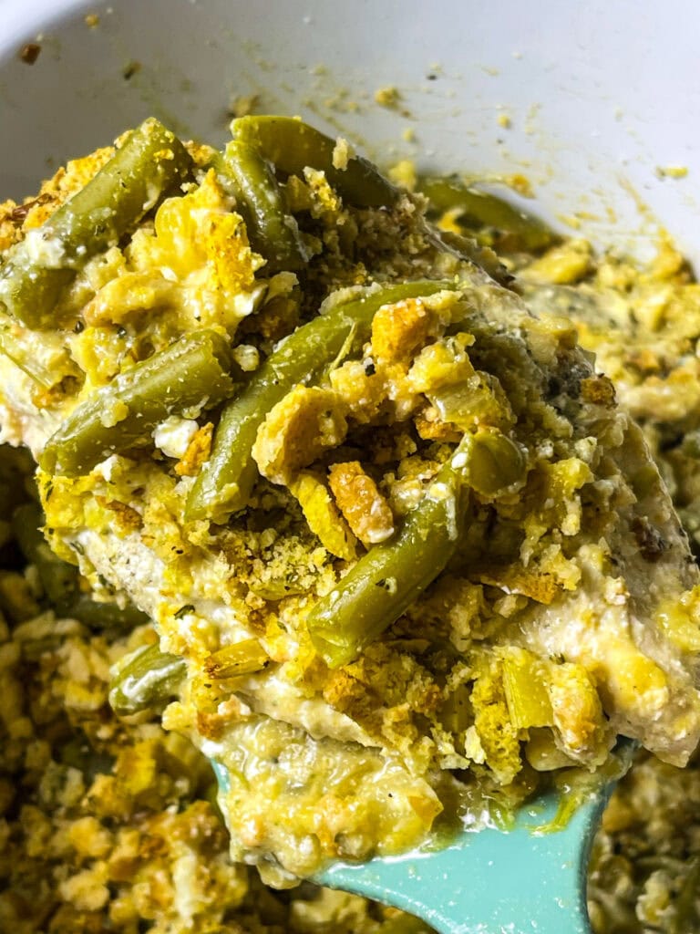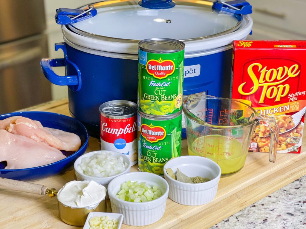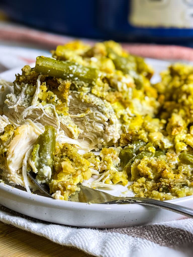 Tender, juicy chicken breasts are slow cooked with a creamy sauce, savory stuffing, and green beans for a complete meal all in one pot. It’s classic comfort food with almost no effort—just toss it in the crock pot and go live your life.