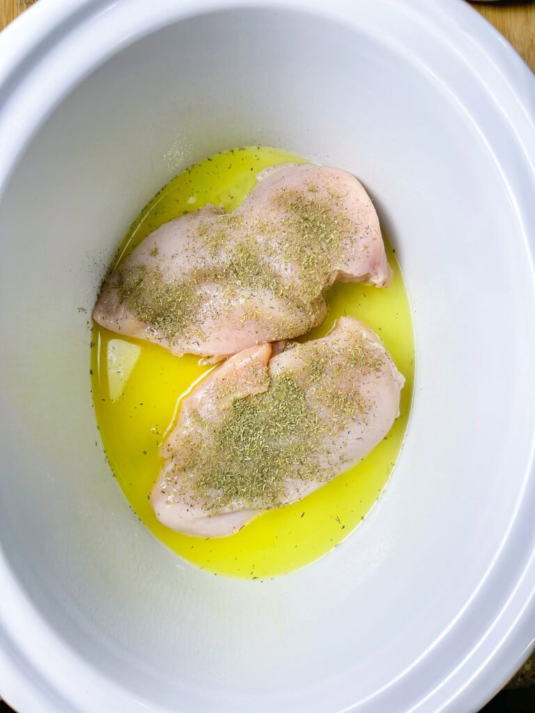 - Season the chicken – Place chicken breasts in the crock pot and pour in the chicken broth. Sprinkle half of the sage, rosemary, salt, and pepper over the chicken.