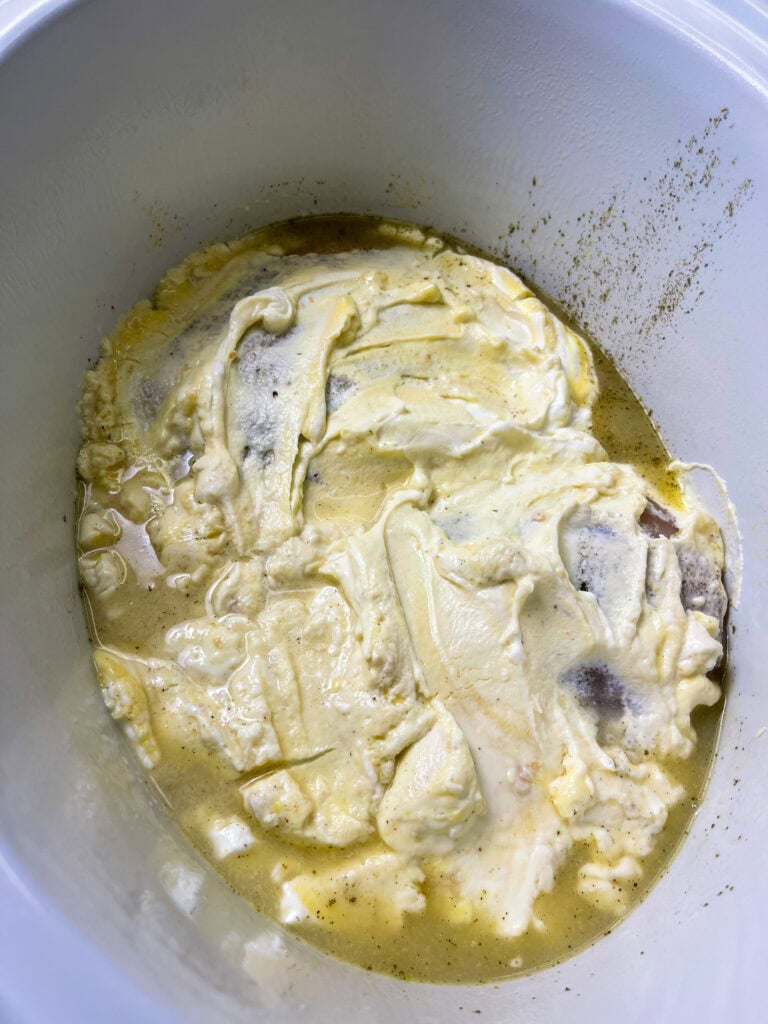 Season the chicken – Place chicken breasts in the crock pot and pour in the chicken broth. Sprinkle half of the sage, rosemary, salt, and pepper over the chicken.