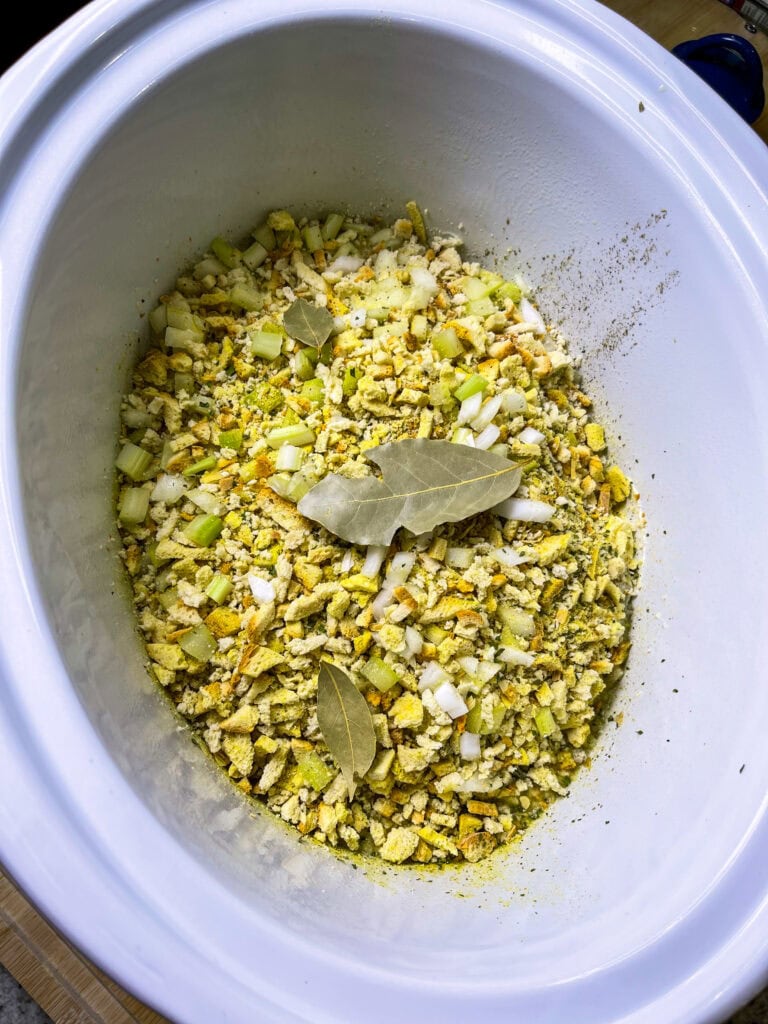- Prepare the stuffing – In another bowl, mix the stuffing, remaining seasonings, onion, celery, and garlic. Sprinkle this mixture over the soup layer (do not stir). Place bay leaves on top.