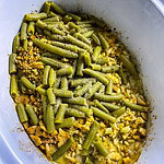 - Uncover, place drained green beans on top of the stuffing, and season with salt, pepper, and garlic powder to taste.
