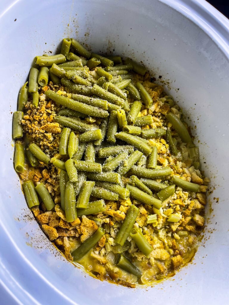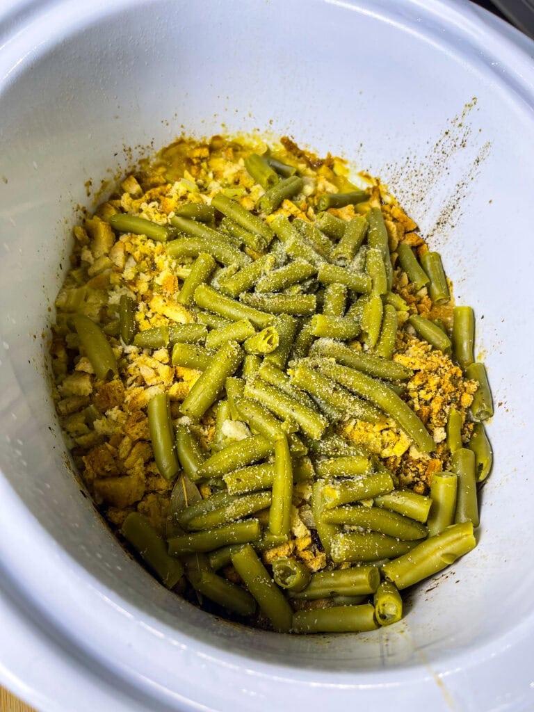 Add the green beans – Uncover, place green beans on top of the stuffing, and season with salt, pepper, and garlic powder to taste.