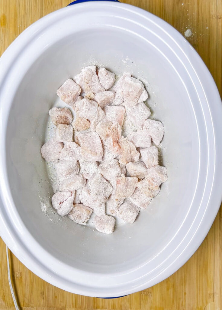 - In a bowl, add the chicken, salt, onion powder, pepper, and cornstarch. Toss to coat the chicken. Place the chicken into the crock pot.