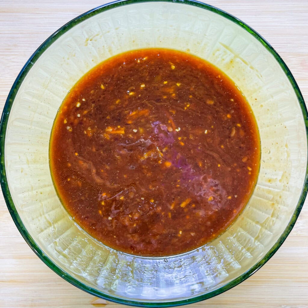 - In a separate bowl whisk together the orange marmalade, BBQ sauce, garlic, sesame oil, honey, and soy sauce. Pour the mixture over the chicken.