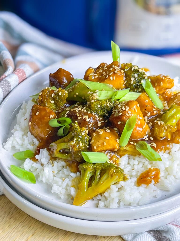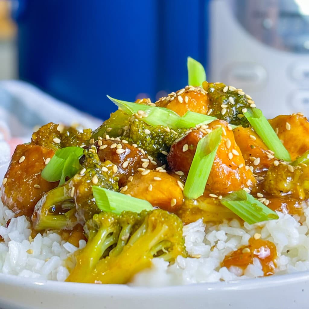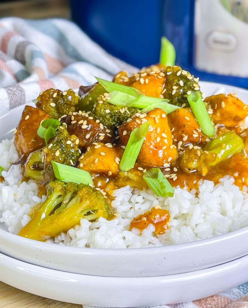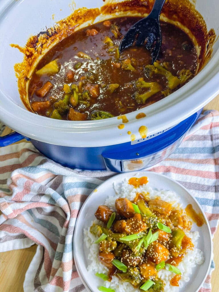 - Turn off the crock pot. Divide the rice between 4 bowls. Spoon the orange chicken and broccoli over top the rice. Garnish each bowl with sesame seeds and sliced green onions for a pop of color, dig in and enjoy!