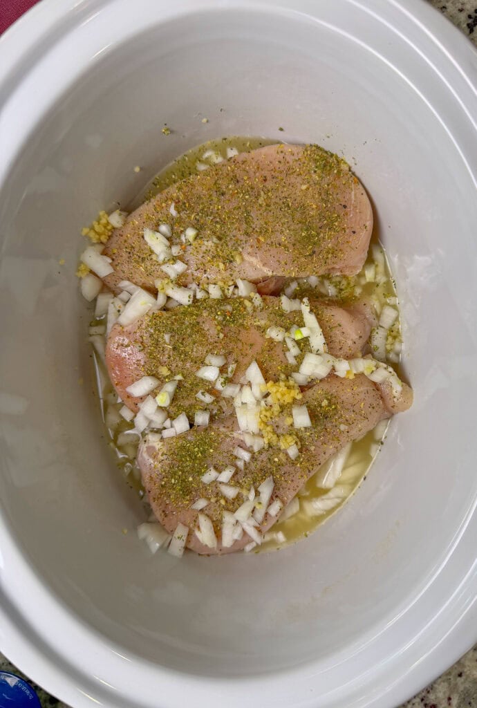 Spray your crock pot with nonstick spray. Pour in the chicken stock, then place the chicken breasts, diced onion, and garlic on top. Sprinkle with salt, pepper, and Italian seasoning.
