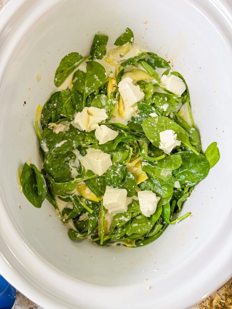 - Add artichoke hearts, cream cheese, heavy cream, Parmesan, and spinach to the crock pot. Stir and cook on HIGH for 15 minutes.