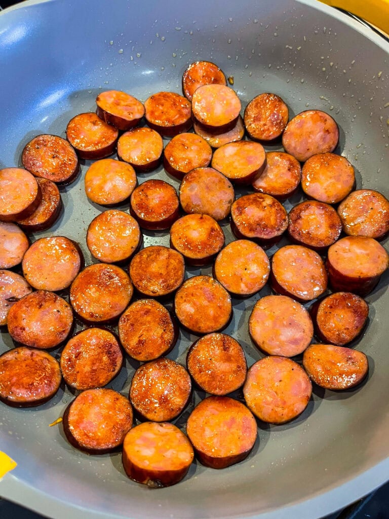 - In a skillet over medium-high heat, sear the sliced sausage on both sides. (Optional but highly recommended for flavor. If short on time, you can skip this step.)
