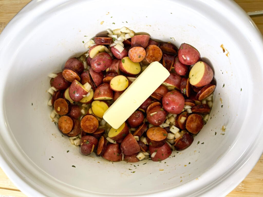 - Add the sausage to the crock pot and stir. Place the stick of butter on top.