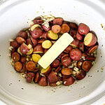 Layer it in: Add sausage to the crock pot and stir. Place the stick of butter on top.
