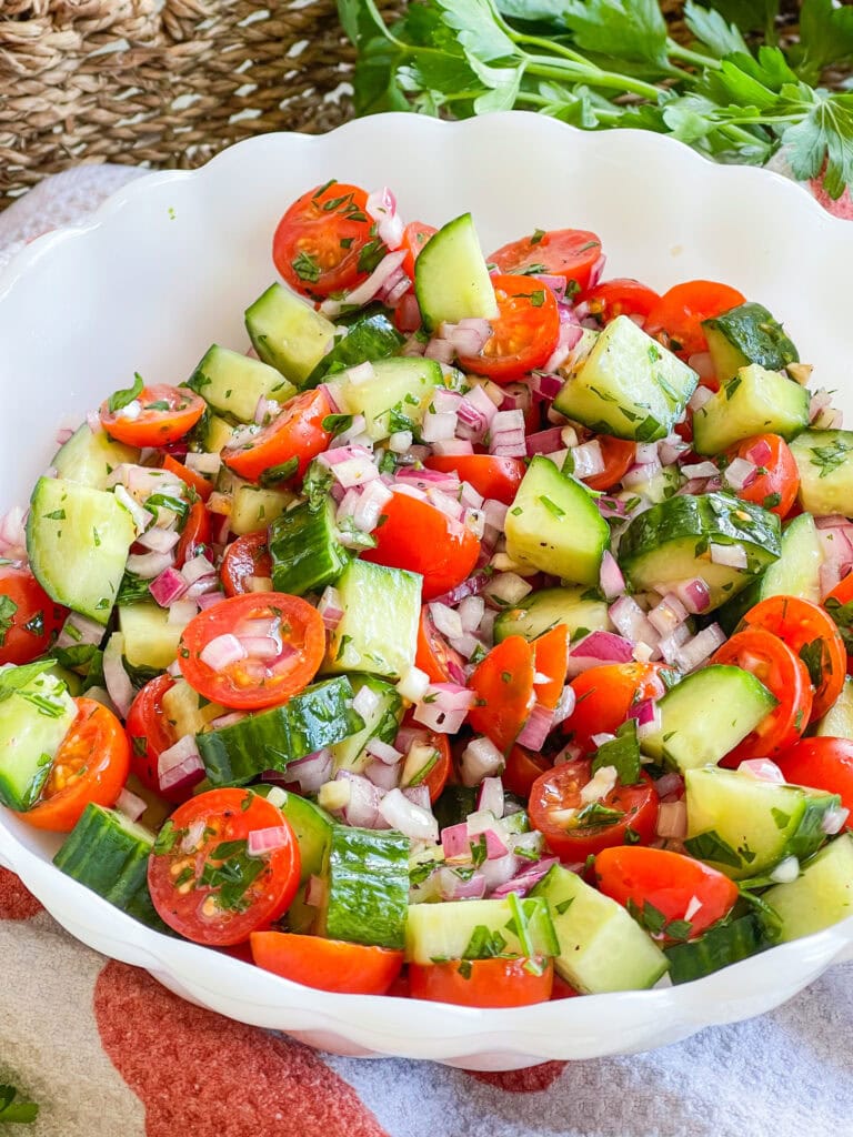 - Combine the vegetables: In a large mixing bowl, add the chopped cucumber, cherry tomatoes, diced red onion, and chopped parsley.