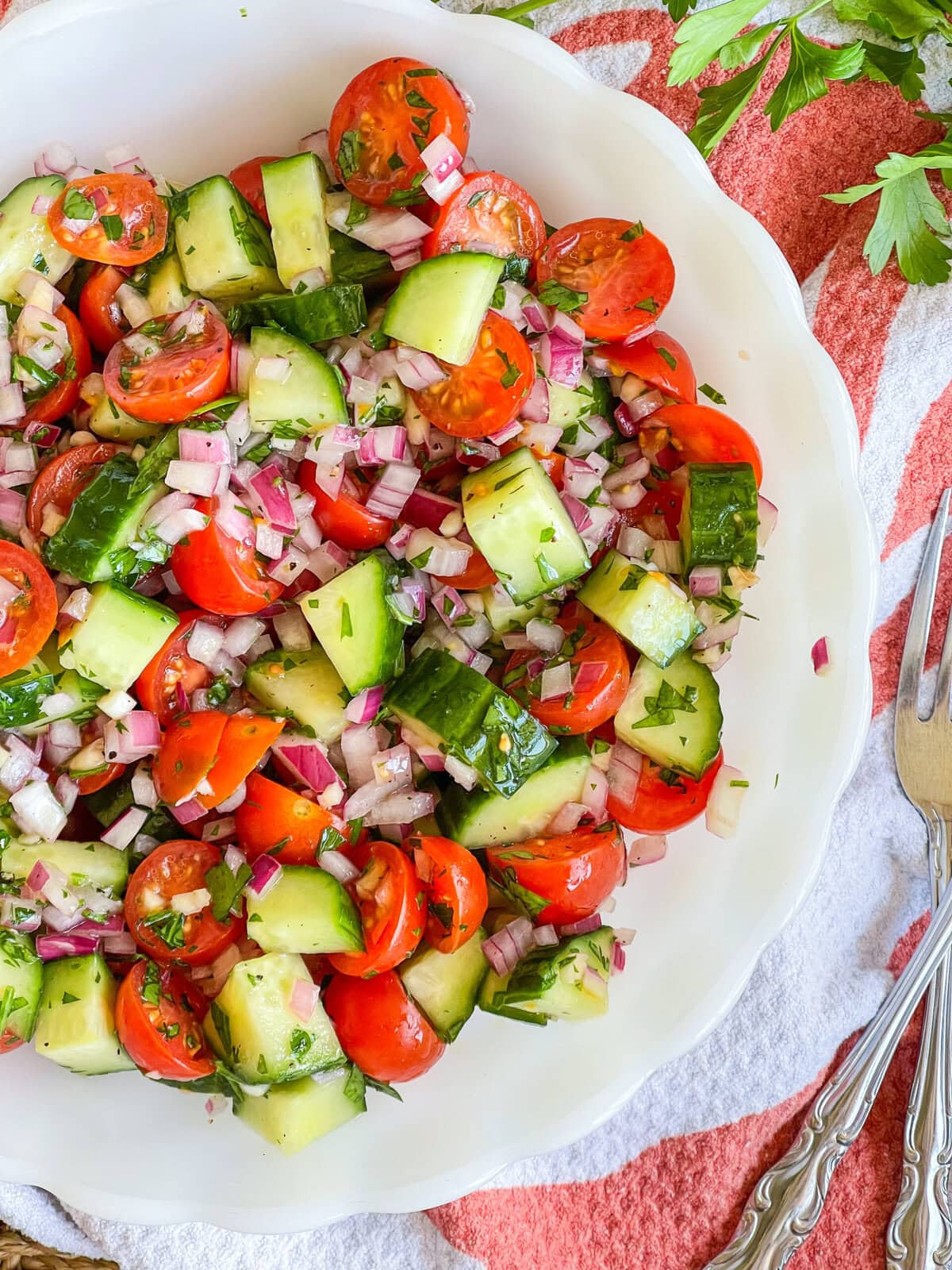 Cucumber, Onion and Tomato Salad is the most refreshing summer salad with crisp cucumbers, juicy cherry tomatoes, red onions and a deliciously tangy vinaigrette dressing.