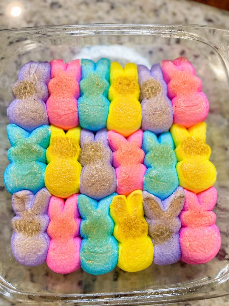 Pour the chocolate chips into a baking dish and spread them out evenly. Top with marshmallow Peeps (as many as you can fit ๐).