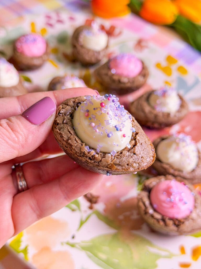 As soon as they come out of the oven (while theyโre still warm!), use a teaspoon โ I used a ยฝ tablespoon โ to gently press an indent into the center of each brownie โegg.โ
