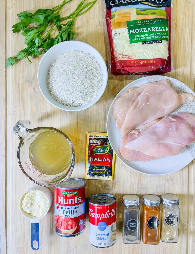 - In a 9×13 baking dish, whisk together the rice, cream of chicken soup, chicken broth, diced tomatoes, half of the Italian seasoning packet, paprika, black pepper, garlic powder, and Parmesan cheese.