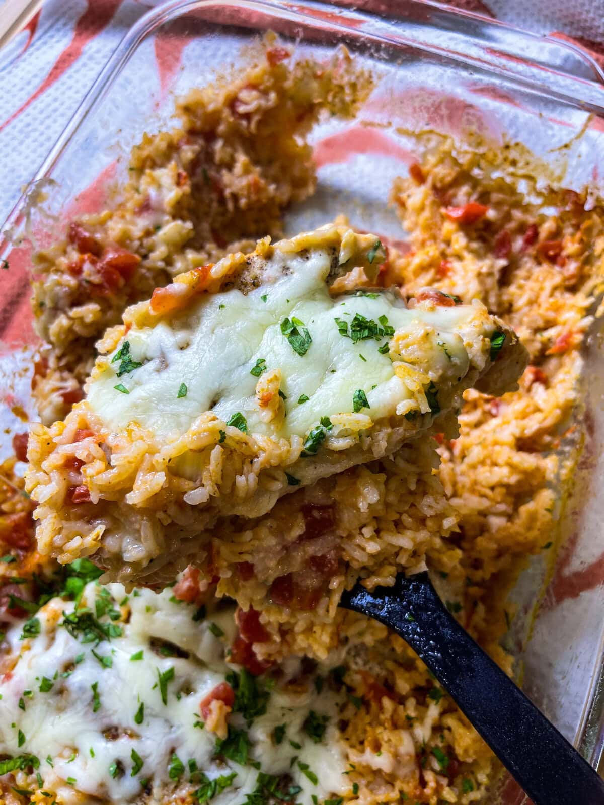 Uncover and fluff the rice with a fork. Sprinkle mozzarella cheese on top of the chicken and return to the oven for 5 minutes, just until the cheese melts.