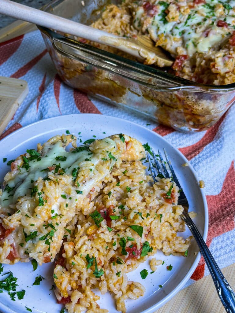 If you love a one dish recipe of chicken and rice, like I do, this dish is for you! Mississippi Chicken & Rice, Creamy Mushroom Soup Chicken and Rice, and Cheesy Chicken Rice & Broccoli are also one pan chicken and rice favorites you’ve got to try.