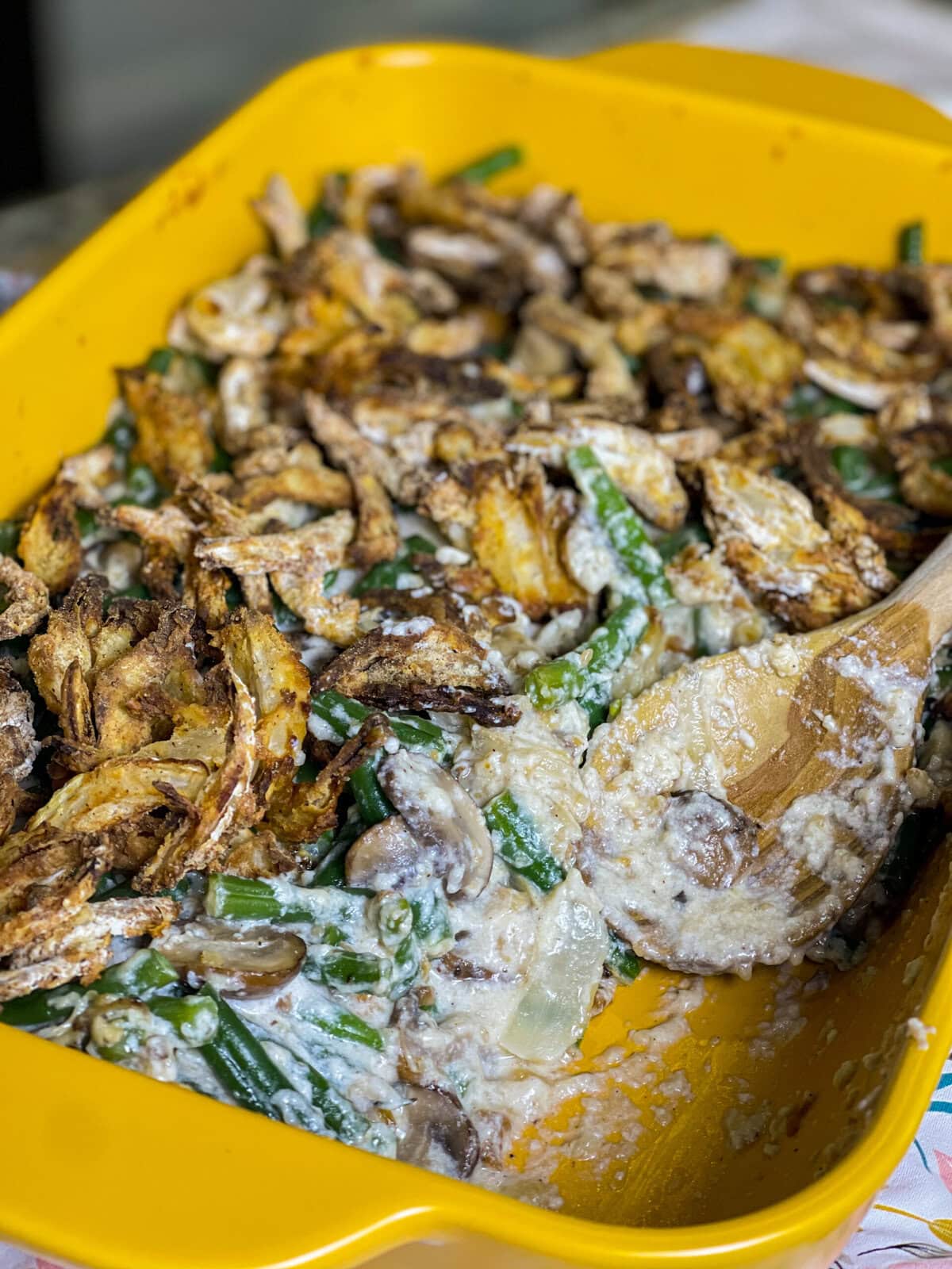 - Stir green beans and half the crispy onions into the mushroom sauce.
