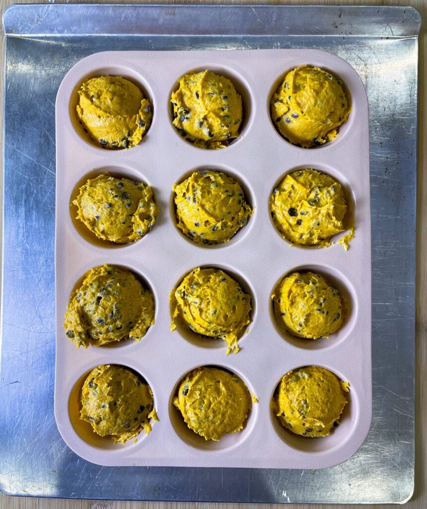 - Fill the muffin cups: Divide batter evenly among the 12 muffin cups. Sprinkle a few extra chocolate chips on top for that bakery-style look.