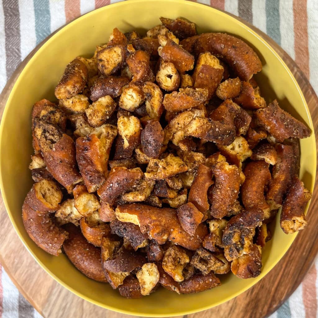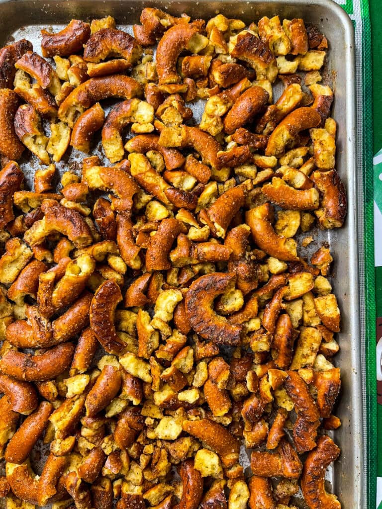 - Bake for 12–15 minutes, stirring once if you’d like, until the pretzels are golden and crisp.