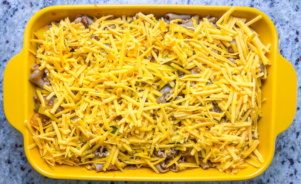 - Add half of the pasta mixture to the prepared baking dish. Sprinkle with 1 cup of shredded cheddar cheese. Layer the remaining pasta on top. Finish with another 1 cup of shredded cheddar cheese.