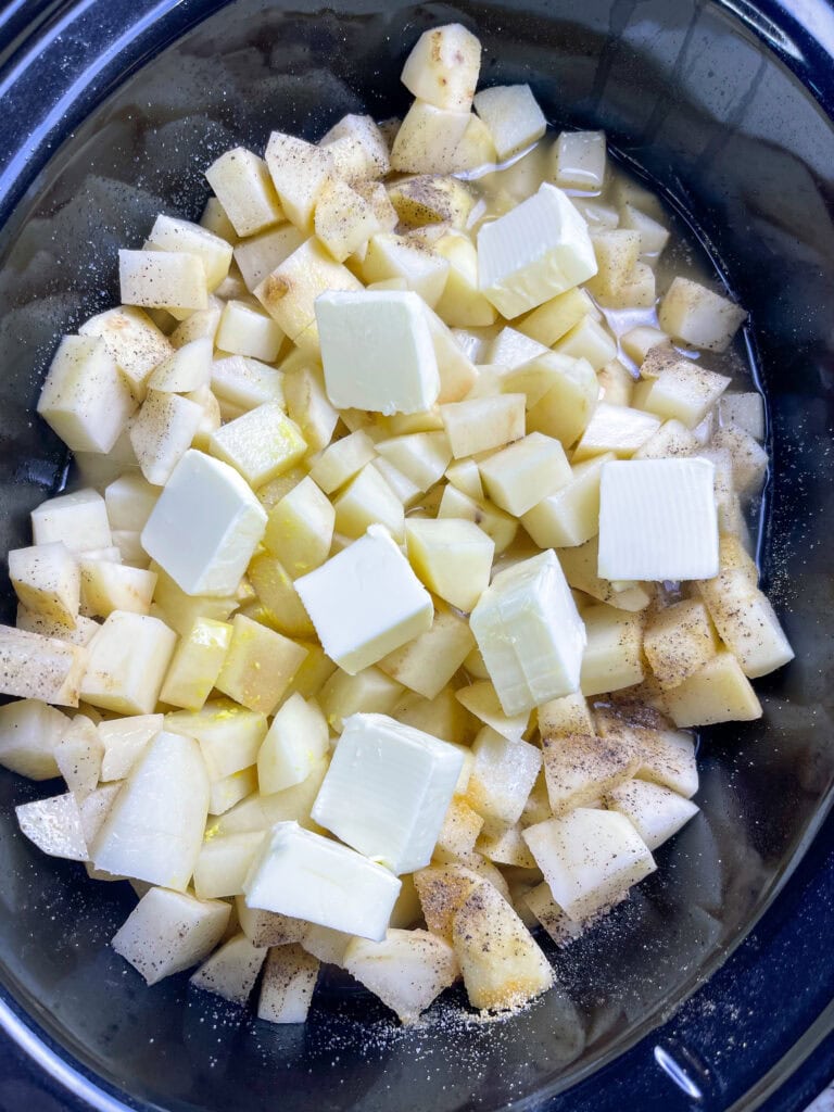 Load the slow cooker: Add potatoes and chicken broth to a 6-quart (or larger) slow cooker. Sprinkle in salt, pepper, and garlic powder. Slice 1 stick of butter and scatter it over the potatoes.