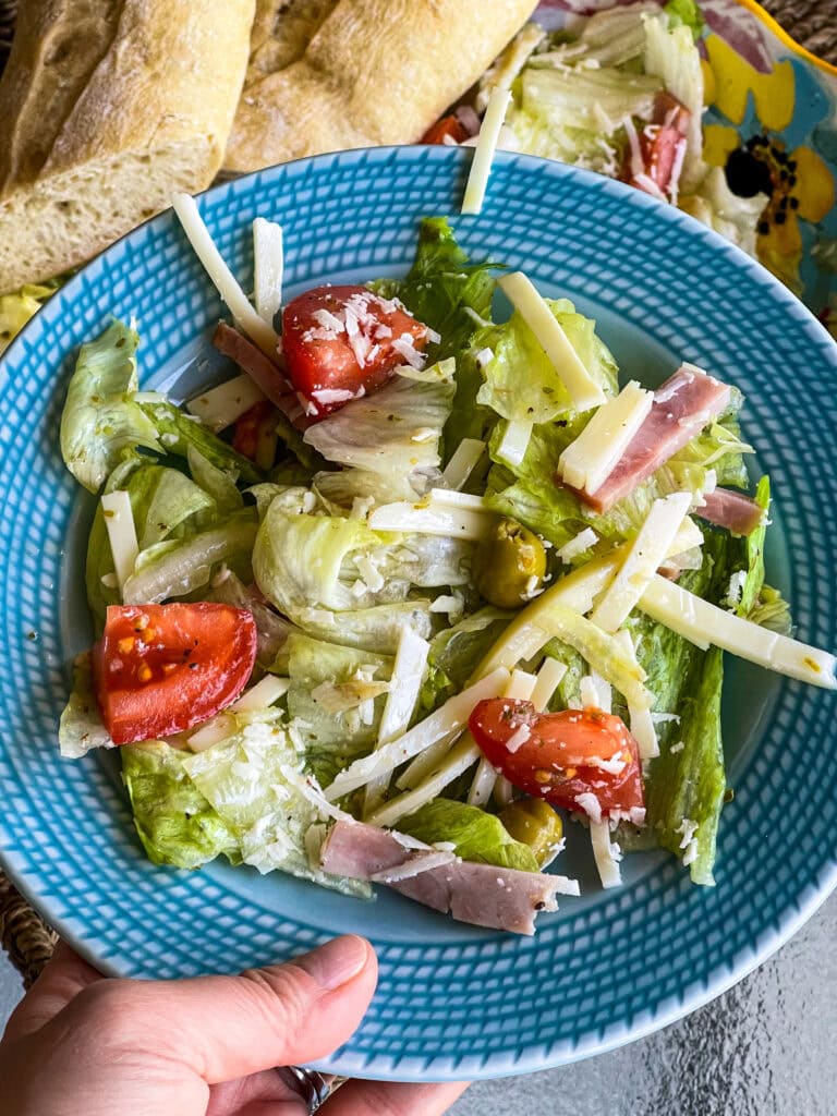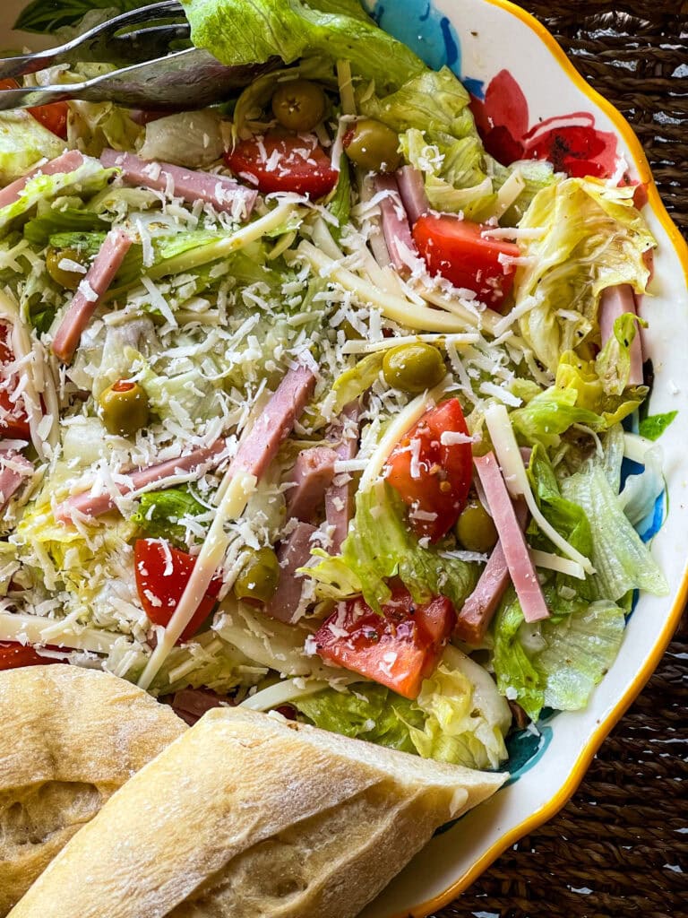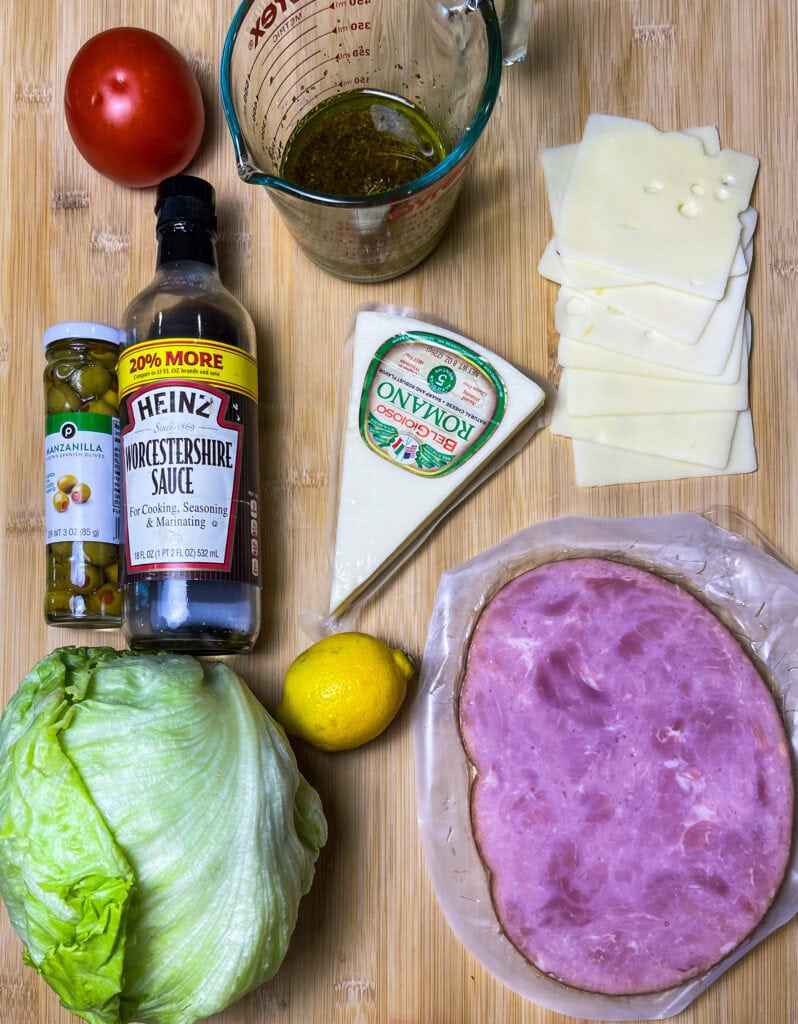 - Put it together: Combine the lettuce, tomatoes, Swiss cheese, baked ham, and olives in a large serving bowl. Drizzle the dressing and toss well to coat.