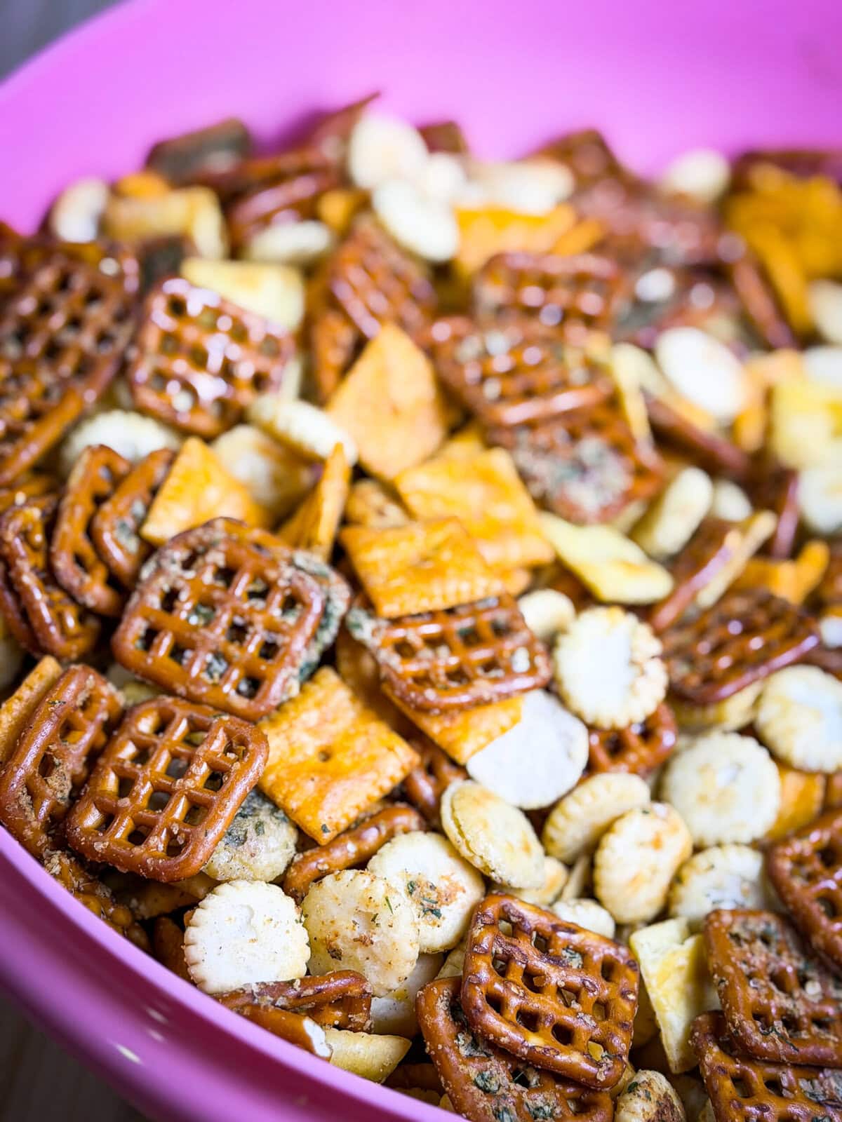 Substitute any of the mix-in ingredients- use cereal in place of the oyster crackers, use goldfish crackers instead of Cheez-its. Add in Bugles, nuts, or bagel chips. Anything goes!